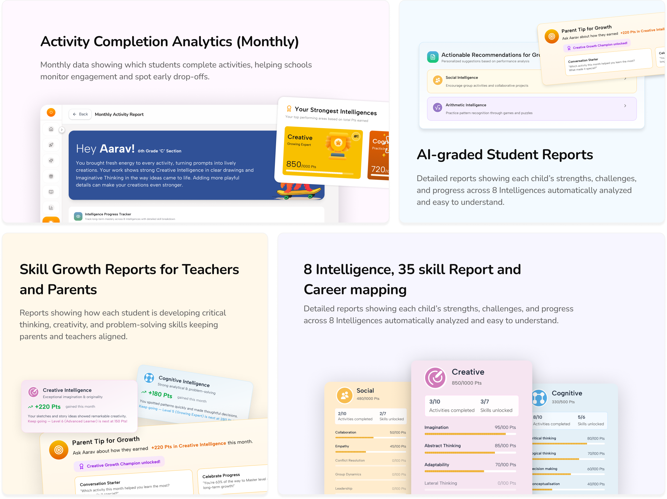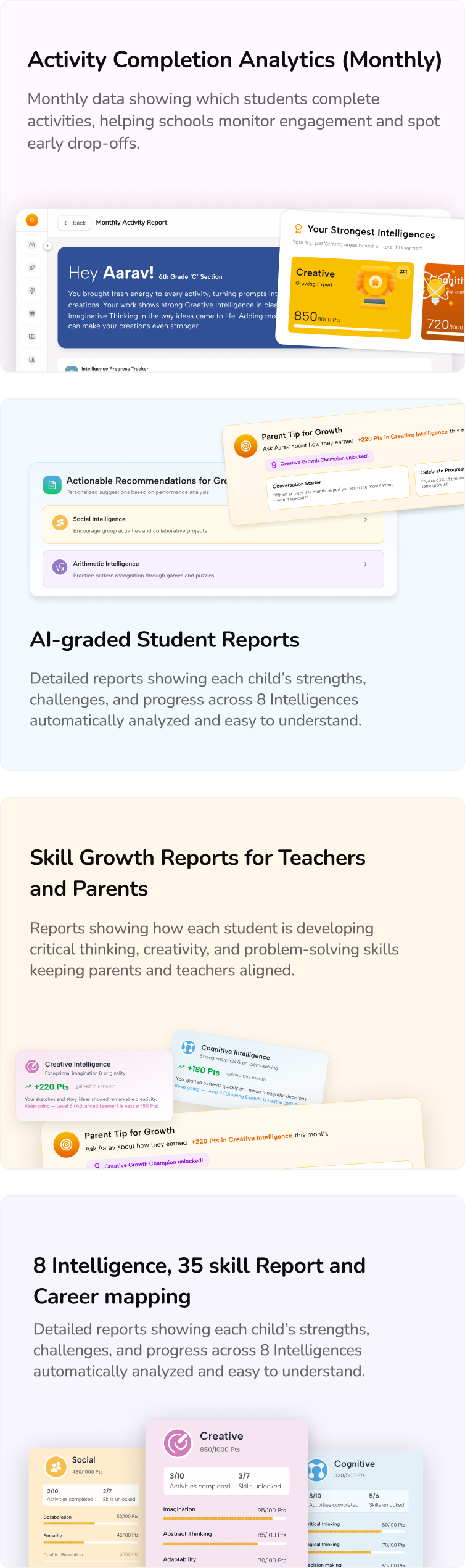 Class-level insights, Student-level intelligence mapping, Skill development reports